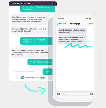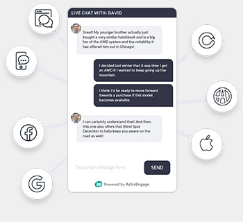 Transform the way you connect with today’s car buyers by using the most comprehensive automotive messaging solution on the market. With ActivEngage, your dealership can have conversations across all your digital channels that increase engagement, leads, appointments and sales.