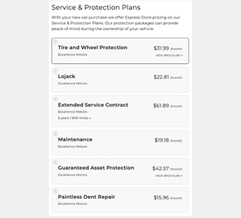 Drive more revenue by prominently promoting your configurable service and protection plans throughout the shopping experience. We work with F&I Express, JM&A, PEN, and others to make sure your F&I menu is complete.